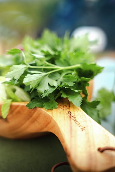 En stor treskål som kan brukes som både tallerken og skål. Skålens mål: høyde ca 3,5 cm, diameter ca 14 cm