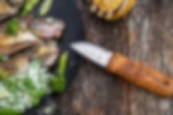 Ustaoset er en liten allround kniv som kan brukes til det aller meste. Denne kniven har et kort knivblad som egner seg spesielt godt når du ønsker full kontroll over kniven. Knivbladet er relativt høyt og rettslipt, som gir en fin innsving mot knivspissen. Knivbladet er 2,2 mm som gir en solid følelse i bruk. Skaftet er laget i oljet masurbjørk, og har et forhøyet parti foran bladet som gir et godt grep for små til mellomstore hender. Kniven egner seg godt sammen med tennstål på grunn av det korte og solide bladet.