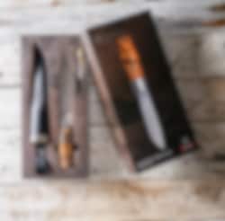 I tillegg kommer den i en elegant gaveeske som inneholder et diamantbryne med tre praktiske funksjoner: ett for flat egg, ett for serratert egg, og et spor spesielt designet for å skjerpe fiskekroker. Knivens bakkslipte blad gjør det mulig å bruke ryggen mot tennstål, noe som skåner eggen for slitasje.