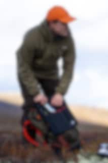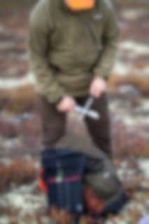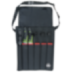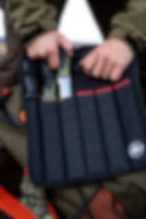festes rundt livet for enkelt tilgang til den kniven du trenger under slakting. Det er plass til fem kniver og et slipestål i knivmappen. Hvert rom til knivene har en hylse som gjør at knivene står sikkert i mappen. Knivene, festes med knapp rundt håndtaket under transport.