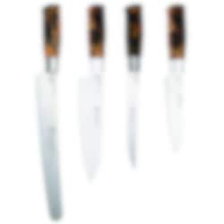 Hunter Premium Chef 4 delers knivsett, består av følgende kniver: Grønnsakskniv 13 cm, Kokkekniv 19 cm, Fleksibel kniv og Moderne brødkniv. Disse knivene er utviklet på Geilo, og vi har brukt samme type stål i denne kniven som vi bruker i våre friluftskniver og kjøkkenkniver med treskaft. Dette gjør at knivseggen holder seg skarp i lang tid. Skaftet som brukes på knivene er det samme som brukes i resten av Hunter-serien. Vi har mottatt mange positive tilbakemeldinger på vårt skaft, og det fungerer utmerket som en kjøkkenkniv. Samtidig er det en vakker kniv som vil pynte opp knivlisten på kjøkkenet ditt. Vi anbefaler å vaske kniven for hånd, da treskaftet ikke tåler oppvaskmaskin, og kniven holder seg skarp lenger ved håndvask.