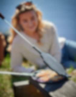 Vaffeljern i støpejern med fem hjerteformede vaffelbiter til bruk over åpen ild. Vafler over åpen ild er et nyttig triks for å få barn til å sette pris på friluftsliv. Fungerer også over grillen. Trehåndtak og skaftlengde ca 45 cm. Størrelse ca 18 × 18 cm.