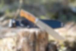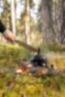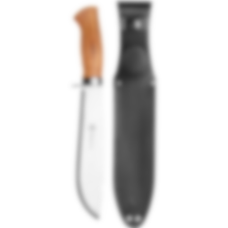 Villmarka stor har et blad med Skandinavisk slip og holk i rustfritt stål. Det gir det tradisjonelle skaftet den ekstra styrken kniven trenger når den blir brukt til å hugge med. Knivbladet har vår signatur; halvmånehakket i ryggen – for å løfte kaffekjelen av bålet. Kniven har et skaft i oliventre og fingervern.